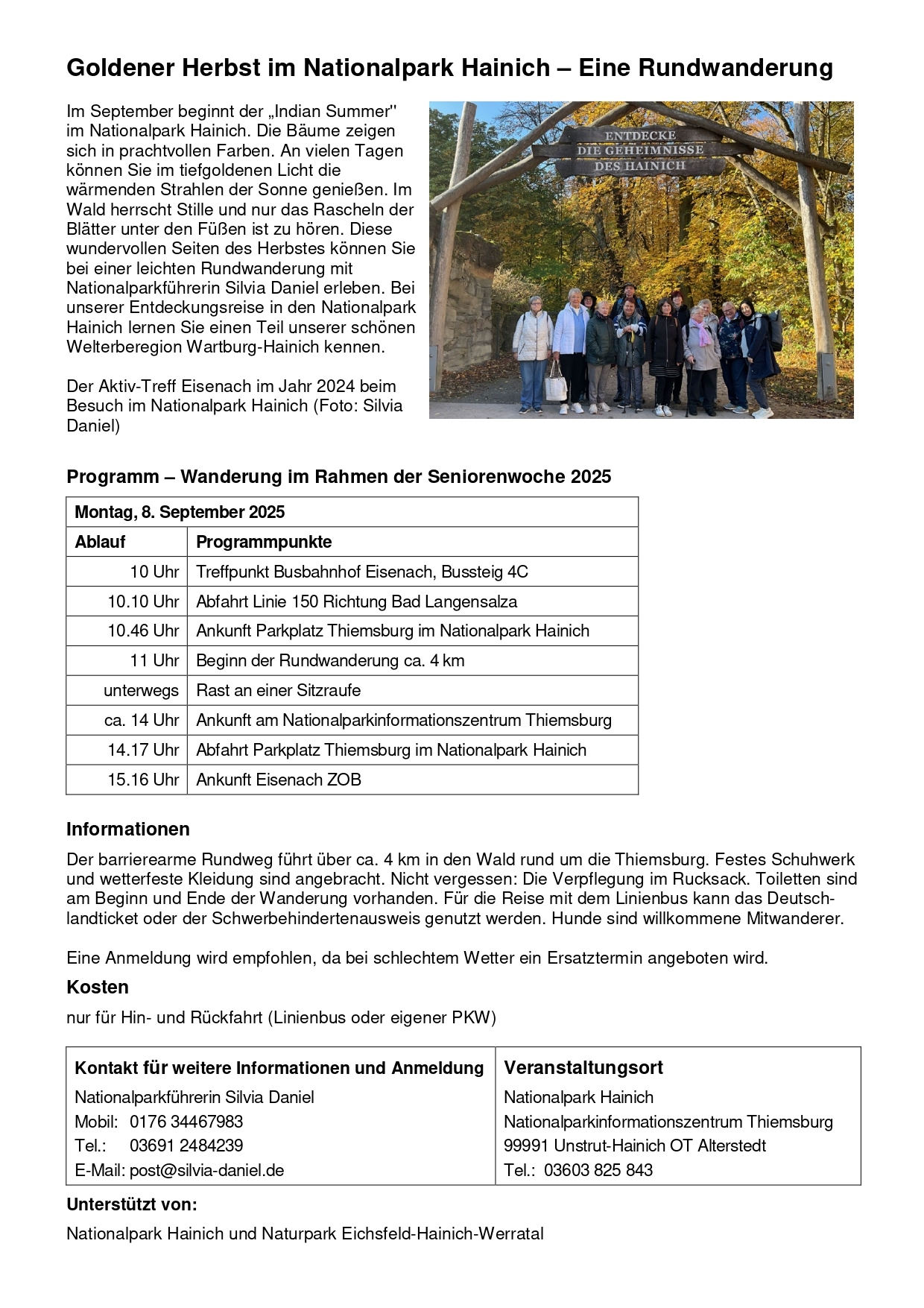 Eine Anreise mit dem Wanderbus aus Richtung Bad Langensalza oder Treffen direkt am Nationalparkzentrum Thiemsburg ist auch möglich. Bitte bei der Anmeldung unbedingt erwähnen.