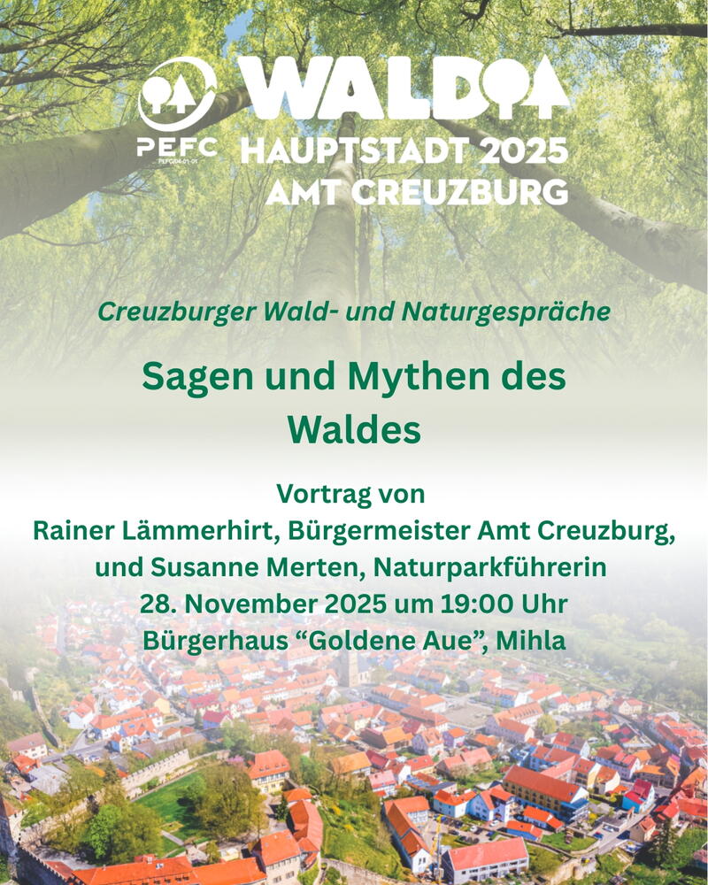 Erleben Sie im Rahmen der Waldhauptstadt Creuzburg 2025 die Creuzburger Wald- und Naturgespräche mit dem faszinierenden Vortrag „Sagen und Mythen des Waldes“. Reiner Lämmerhirt und Susanne Merten nehmen Sie mit auf eine atmosphärische Reise durch geheimnisvolle Geschichten, altes Wissen und lebendige Naturtraditionen. Tauchen Sie ein in die magische Welt des Waldes!